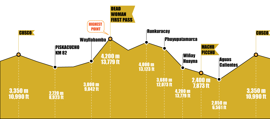 Levantarse temprano y desayunar, sobrevivir a la montaña más alta (Warmi Wañusqa, Abra de la Mujer Muerta), grandiosas vistas, hora del almuerzo, happy hour, té para la altura. Distancia recorrida: 9 km.